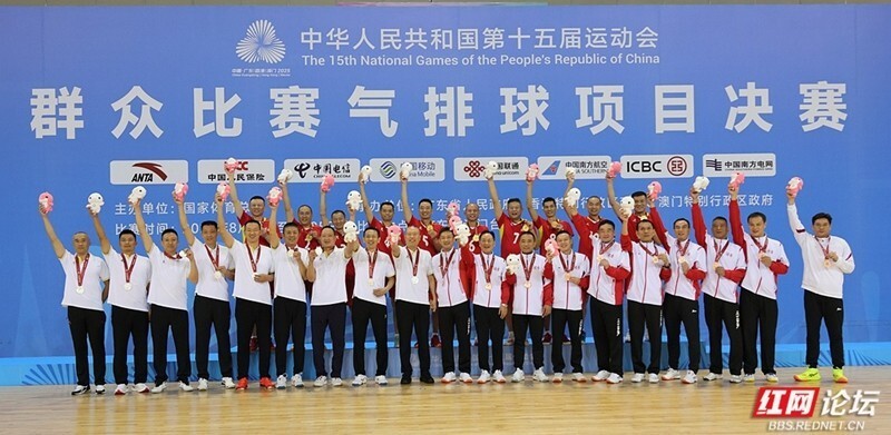 在第十五届全国运动会群众组气排球项目决赛中,湖南男子中年代表队在紧张激烈的三四名争夺战中顶住压力、稳扎稳打,经过三局鏖战,最终以2比1力克香港代表队,成功斩获一枚含金量十足的铜牌,为湖南代表团再添荣耀!